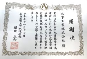 応急復旧活動に対し、名古屋市上下水道局長様より感謝状をいただきました